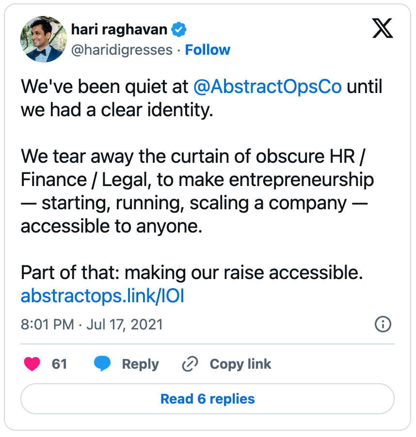 Note: AbstractOps and AngelList have a friendly relationship: we sometimes partner on initiatives, our executives are stockholders in each other (Naval, Avlok, Nivi, etc. are investors in AbstractOps; Hari is an advisor to AngelList). This is simply a tacit acknowledgement and hat-tip, that AngelList’s work and products have been key to AbstractOps’ fundraising and building.