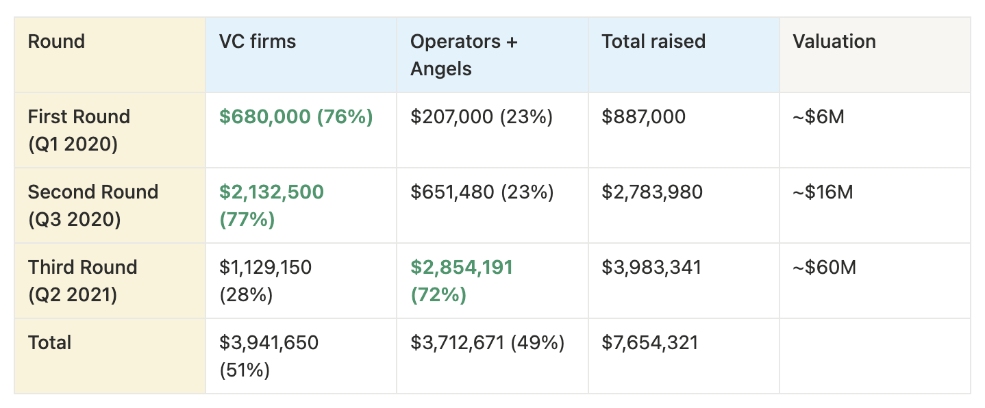 😇 The 70% ratio flipped in our third round; it wasn’t a VC round with “room for operator angels,” but an operator angel round with “room for VCs.”